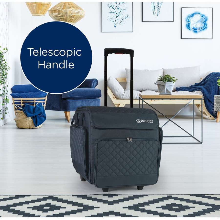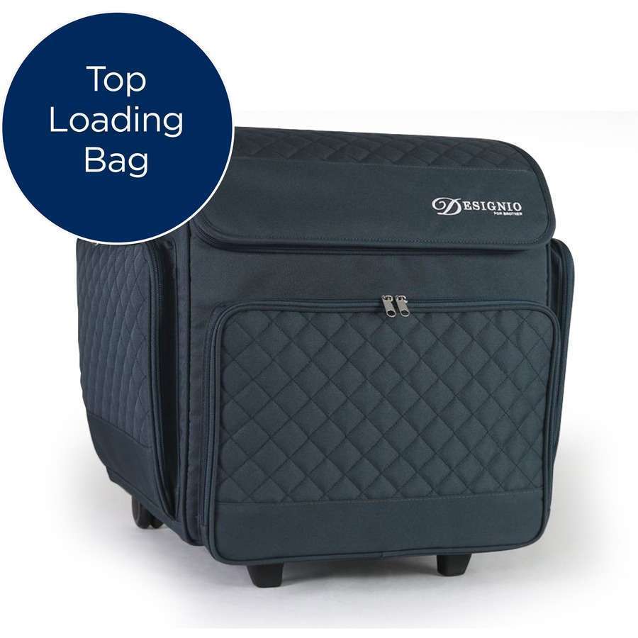This custom luggage set, which includes a rolling bag with zippered pockets, is specifically designed to transport and protect Brother serger machines. The rolling bag has a telescopic handle and a sturdy, easy-glide chassis for easy maneuverability. In addition, it features a stylish contemporary fabric and multiple zippered storage compartments designed to hold notions and supplies!