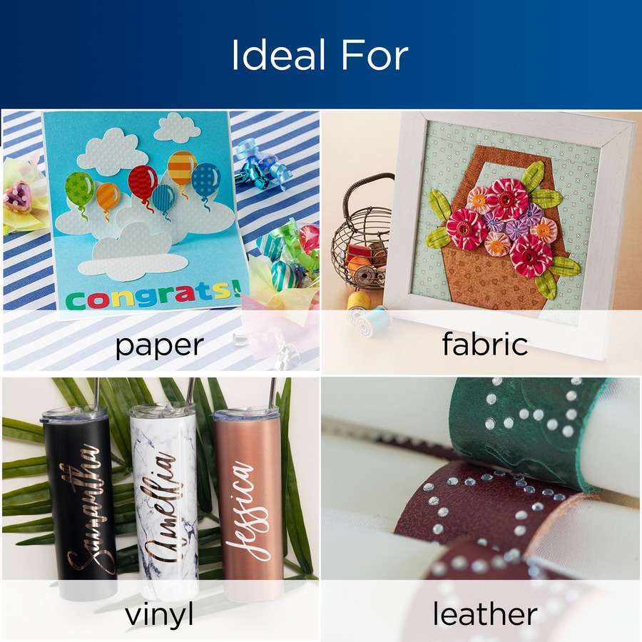 The machine can cut a variety of materials up to 3mm thick, including paper, vinyl, fabric, foam, and felt.