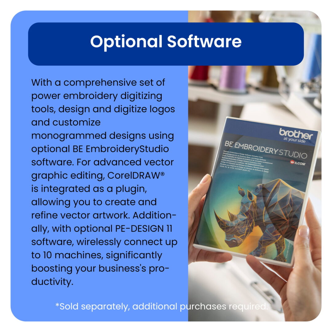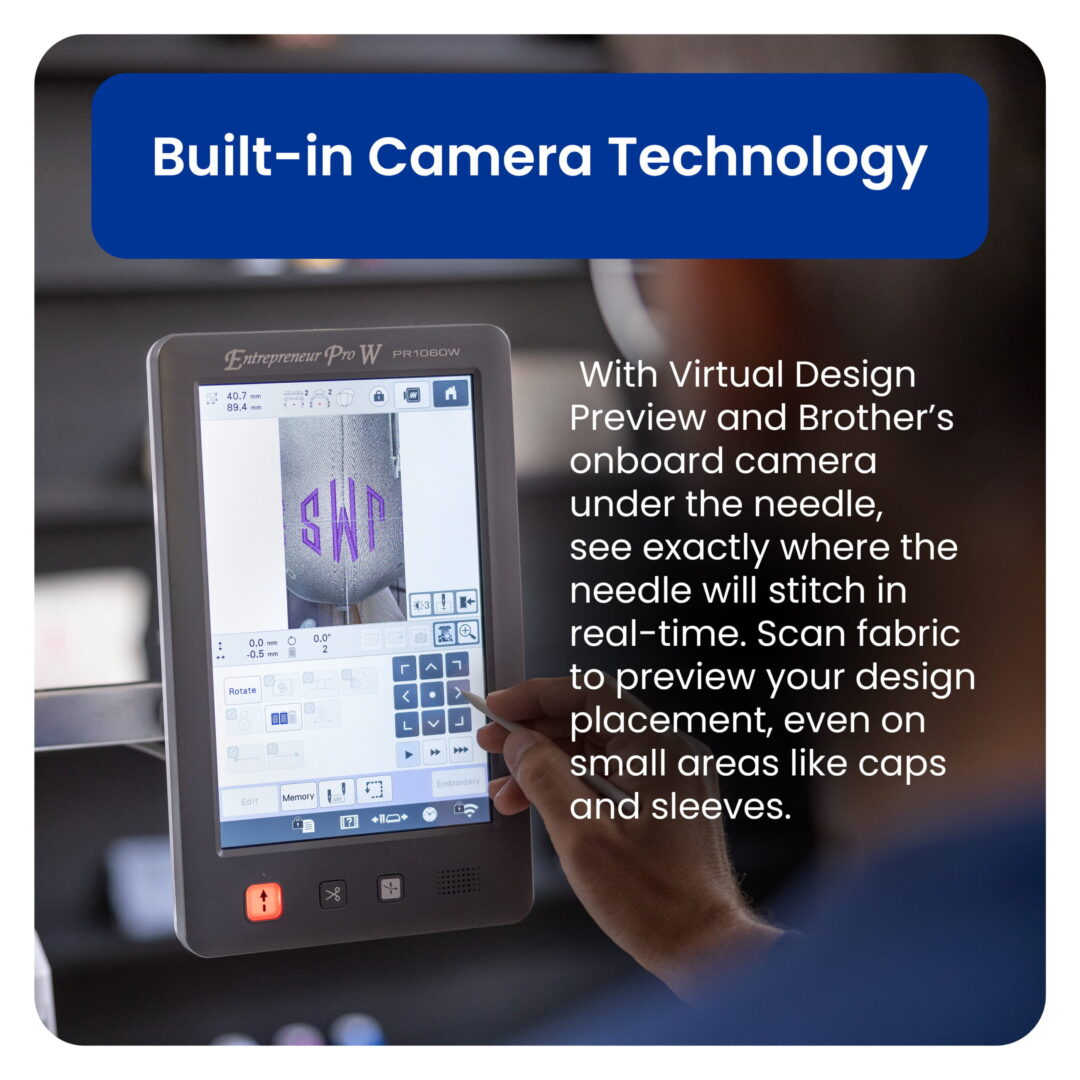 10-needle professional embroidery machine. Max embroidery area 8″ x 14″, built-in camera, Matrix Copy feature, and fast acceleration to 1,000 spm. Includes multiple frames and Tubular Frame Table.