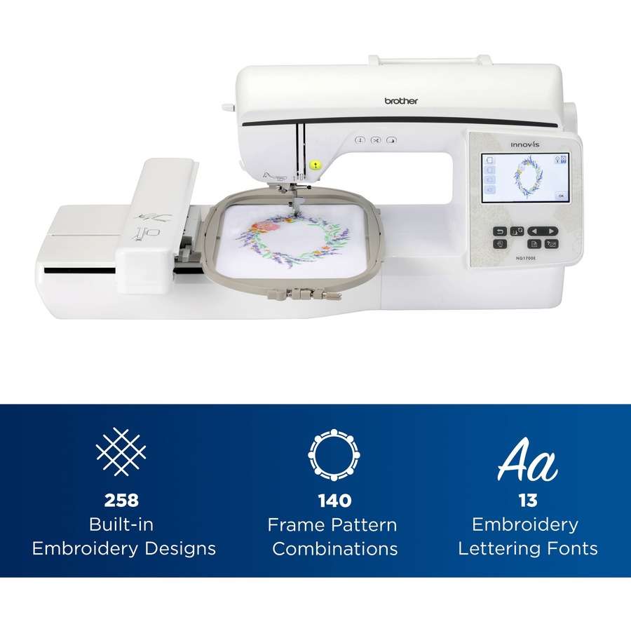 - An abundance of built-in designs The NQ1700E comes with 258 built-in embroidery designs, 140 frame pattern combinations, and 13 embroidery lettering fonts.