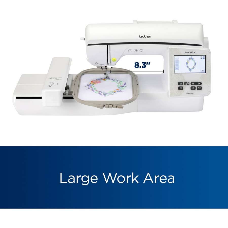 - Large work area Enjoy working on a generous 6″ x 10″ embroidery area, and with a sizeable 8.3″ from needle to arm so you can tackle big projects.