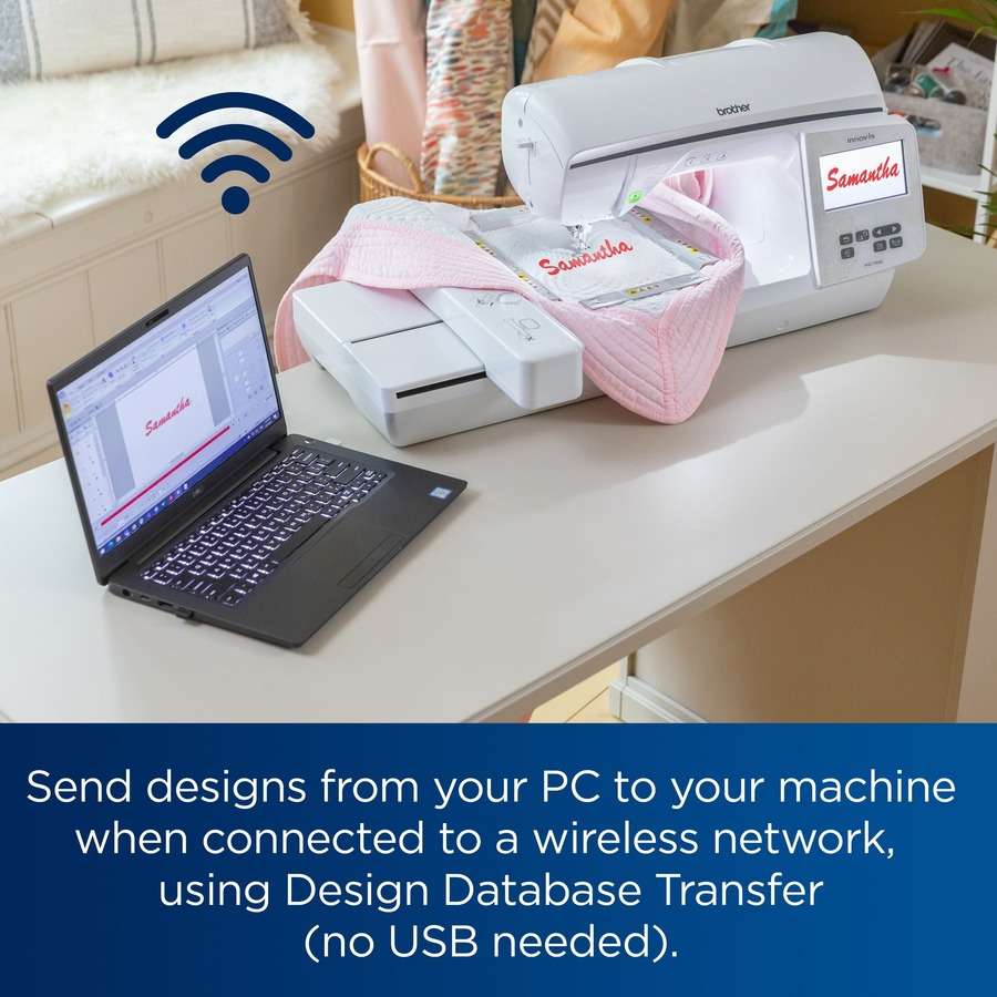 - Wireless capability The durable NQ1700E has wireless ability, so you can send designs from your PC to your machine when connected to a wireless network, using Design Database Transfer (no USB needed).