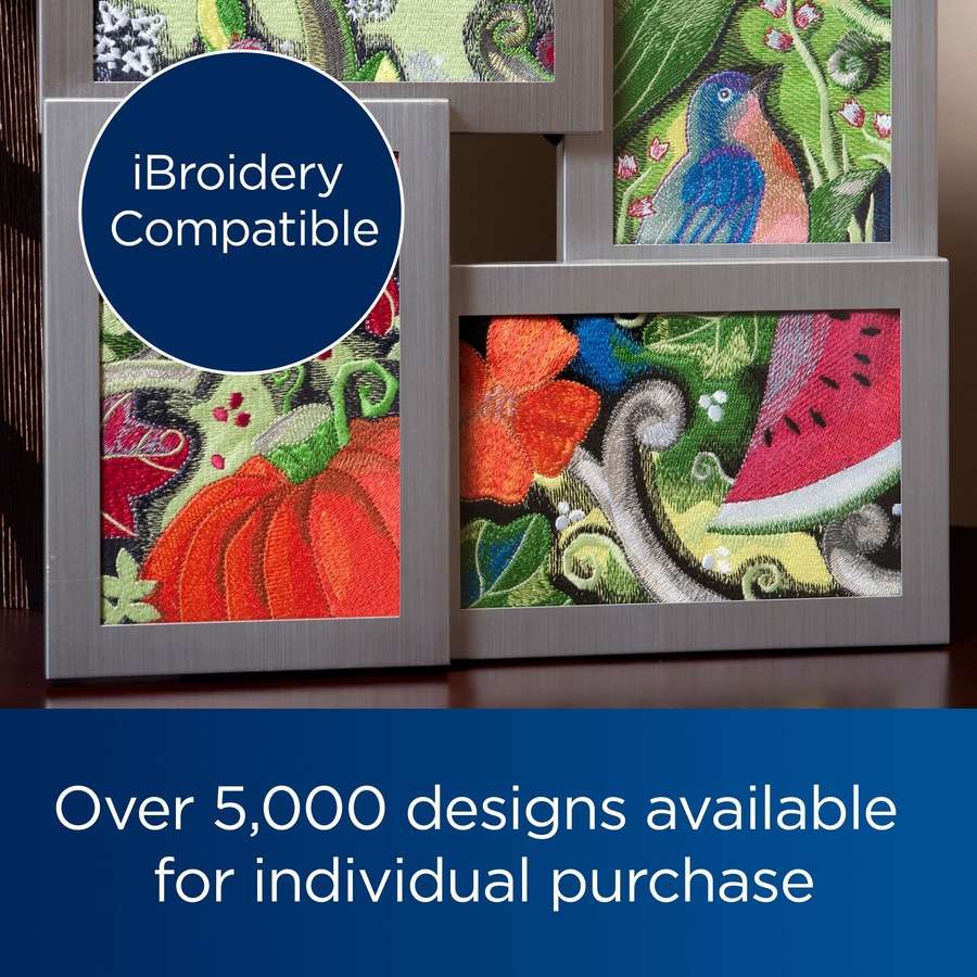 - iBroidery compatible Peruse over 5,000 designs available for individual purchase on iBroidery.com. Who knows what you’ll create next!