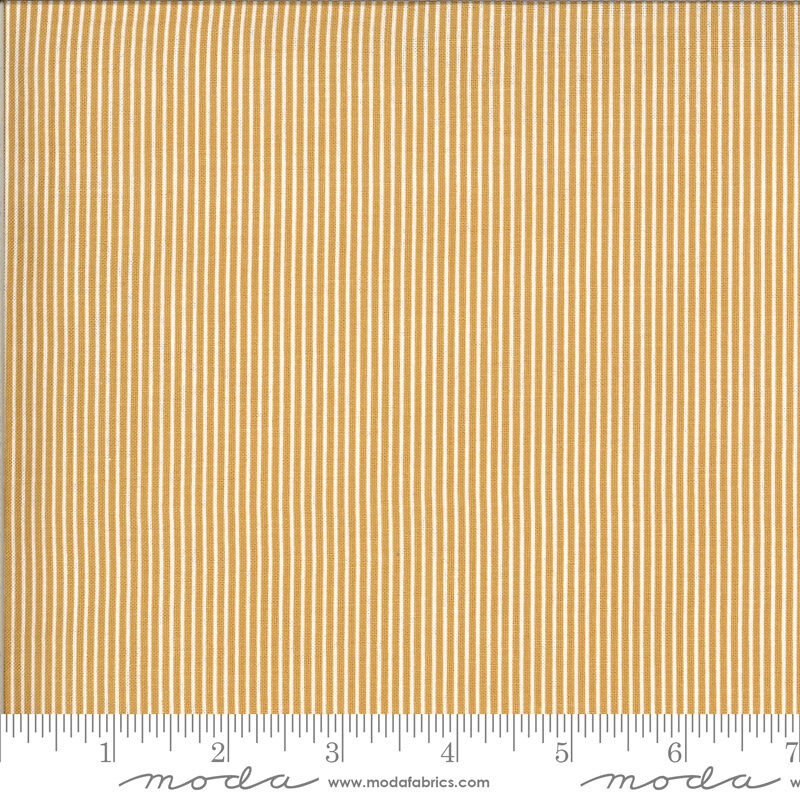 Moda Folktale Skinny Stripes Golden fabricโ€”100% quilting cotton, ideal for crafting elegant quilts and projects. Gold and white stripes add a timeless touch to your creations.