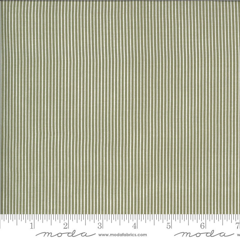 Moda Folktale Skinny Stripes Olive fabricโ100% quilting cotton, 42/44 wide. Perfect for crafting elegant quilts or stylish home decor with its chic green and white stripe pattern.