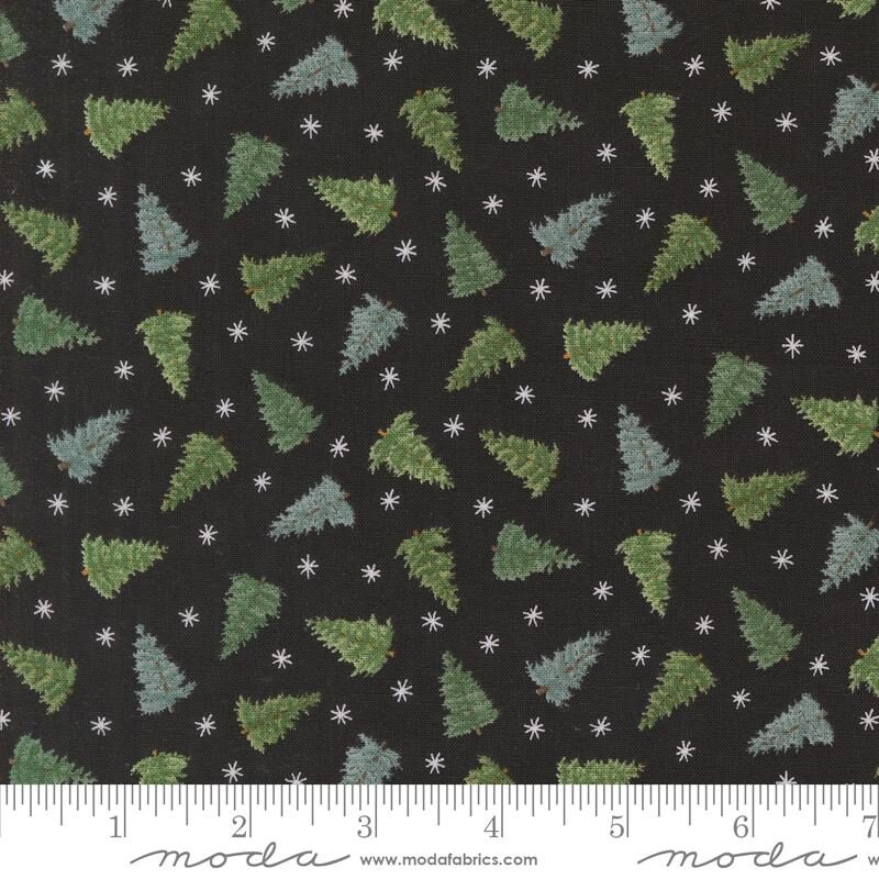 Moda Winter Friends Charcoal Black fabricโperfect for cozy quilts and crafts. Features charming tree designs, adding warmth and festive spirit to your winter projects.