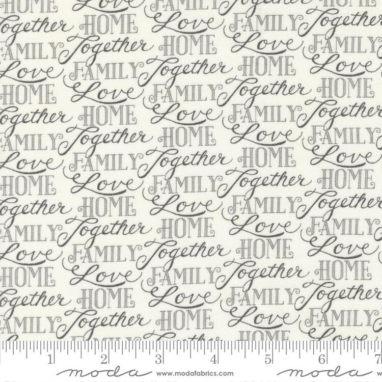 Moda Happiness Blooms fabricโelegant white washed design with heartwarming words. Perfect for quilts and crafts, adding a touch of love and warmth to your projects.