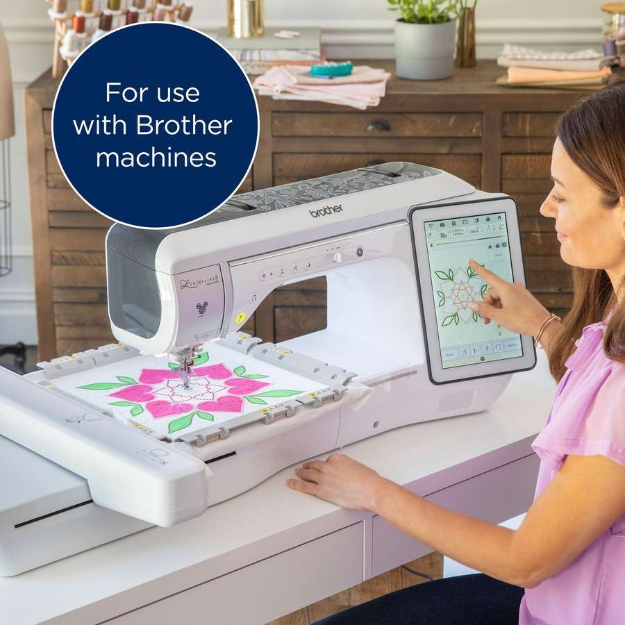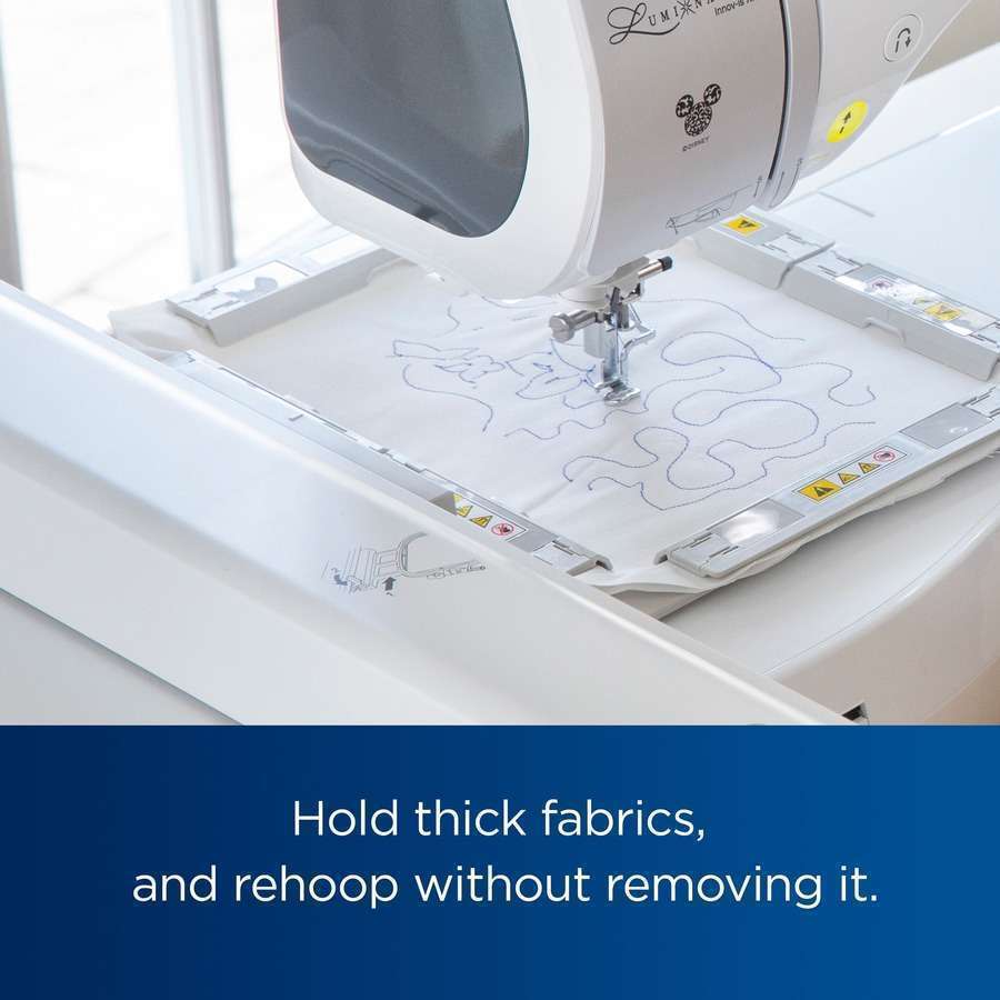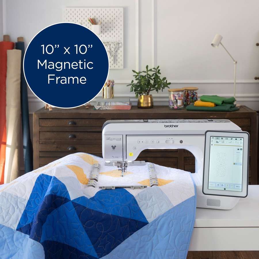 Quilting, couching, and embroidery have never been so fun with the new 10″ x 10″ magnetic frame. Hoop in a jiffy as the frame’s four magnets quickly fit snugly into place, securing your material without residual hoop marks. This frame can hold thick fabrics, and you can also rehoop without removing it from the machine, making changes to any project much quicker! These frames are versatile and excellent for more oversized garments or items with plenty of room toward the back of the hoop.
