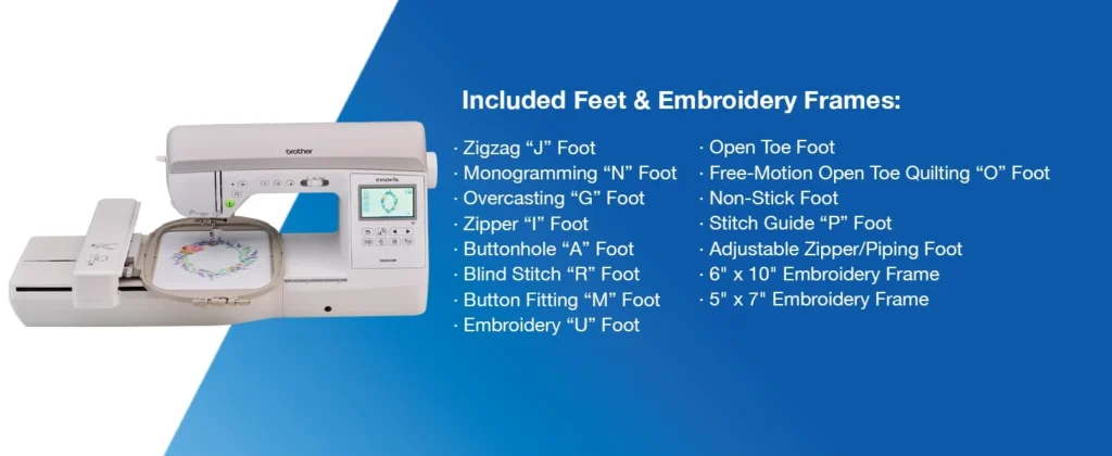 - Included feet: Quilting foot, walking foot, monogramming foot, zigzag foot, blind hem foot, buttonhole foot.