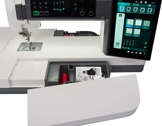 In addition, the nine ultra-bright LED lights are positioned across four key locations on the machine, providing brilliant illumination to reduce eye strain and ensure complete visibility on intricate projects. For even greater focus, the M17 includes three magnification levels that can be attached to the machineโs faceplate. The computerized one-touch needle plate converter adds further convenience, allowing you to switch needle plates at the press of a button for enhanced versatility.
